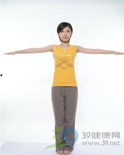 站立,一只手臂向上伸直,另一只手臂从下方穿过,抓住伸直手臂的手指,轻轻向自己方向拉扯。然后换另一侧。